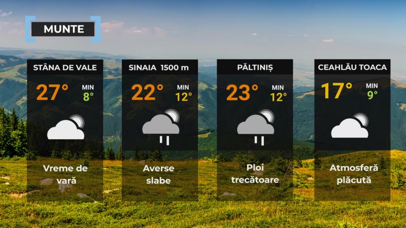 Vremea va fi caldã. Cerul va fi variabil, cu înnorãri temporar accentuate dupã-amiaza şi seara, când izolat vor fi condiţii pentru ploi de scurtã duratã. Vântul va sufla slab şi moderat, temporar cu uşoare intensificãri doar în Munţii Banatului, mai ales noaptea.