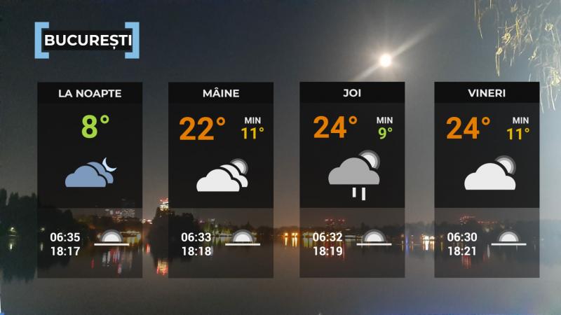 La noapte, cerul va fi temporar noros, iar spre dimineaţã vor fi condiţii pentru ploi de scurtã duratã. Vântul va sufla slab şi moderat. Temperatura minimã, mai mare decât cea specificã datei, va fi de 5...8 grade.