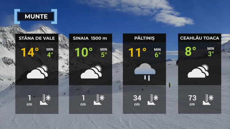 Valorile termice vor fi în continuare mult mai ridicate decât cele specifice datei în toate regiunile, iar în vestul, nord-vestul şi parţial în centrul ţãrii cele diurne vor fi mai ridicate faţã de ziua anterioarã. Pe parcursul zilei cerul va fi temporar noros şi va ploua local în Oltenia şi în nordul Munteniei, iar în celelalte regiuni doar cu totul izolat. Noaptea, nebulozitatea se va accentua în cea mai mare parte a ţãrii, iar ploile se vor semnala pe arii extinse în Banat, Crişana, Maramureş, cea mai mare parte a Olteniei şi Transilvaniei şi pe arii restrânse în rest. Ploile vor avea şi caracter de aversã, trecãtor sunt posibile şi descãrcãri electrice, iar izolat mai ales la munte şi în dealurile subcarpatice ale Olteniei cantitãţile de apã vor depãşi 10...15 l/mp. La munte, la altitudini de peste 2000 m vor fi precipitaţii mixte. Vântul va sufla slab şi moderat, cu intensificãri la munte, cu viteze în general de 60...70 km/h, iar noaptea, în zona înaltã cu rafale de peste 90...100 km/h, dar local şi în vest şi sud-est (în general de pânã la 45...55 km/h) şi pe arii restrânse în centru şi est. Temperaturile maxime se vor încadra între 14 şi 24 de grade, iar cele minime vor fi cuprinse între 2 şi 13 grade. Presiunea atmosferică va fi usor variabilã.