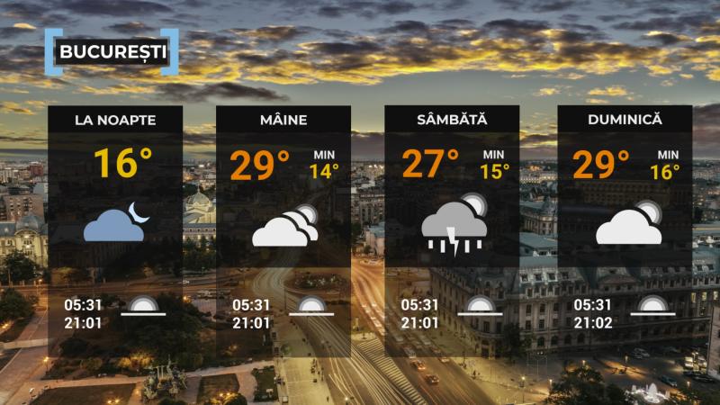 Valorile termice diurne se vor situa în jurul normelor caracteristice datei, doar în Moldova vor fi uşor mai scãzute. Vor fi înnorãri temporare şi averse local în Carpaţii Orientali şi în estul Carpaţilor Meridionali şi pe arii restrânse în Moldova, Muntenia şi Dobrogea. Pe alocuri se vor semnala descãrcãri electrice şi cantitãţi de apã de 10...15 l/mp. În restul teritoriului cerul va fi variabil şi doar izolat va ploua slab, cu o probabilitate mai mare în Oltenia şi Transilvania. Vântul va sufla slab şi moderat în sud, dar va avea local intensificãri în restul teritoriului, cu viteze în general de 40...60 km/h. Temperaturile maxime se vor situa între 20 şi 32 de grade, iar cele minime vor fi cuprinse în marea lor majoritate între 5 şi 15 grade. Pe suprafeţe mici, cu precãdere în depresiuni, se va forma ceaţã. Presiunea atmosferică va fi usor variabilã în timpul zilei, apoi va fi în creştere.