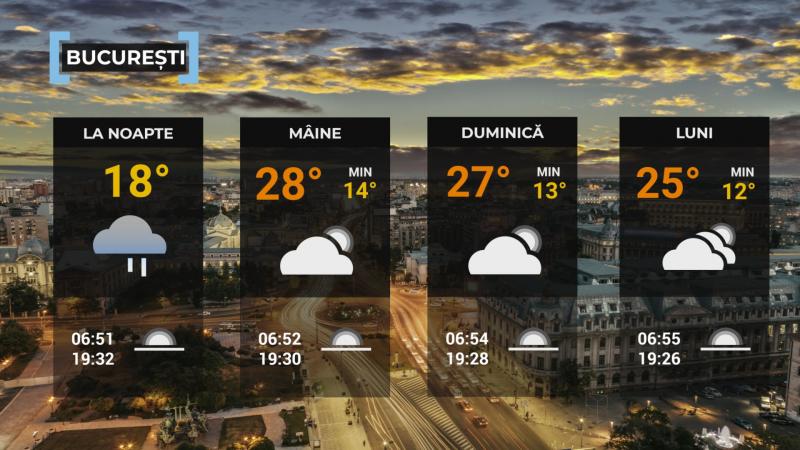 La noapte, cerul va fi variabil, mai mult noros în sudul şi în estul ţãrii. Vor fi averse, pe arii relativ extinse în Moldova, local în Muntenia, Dobrogea, la munte şi cu totul izolat în Oltenia şi posibil estul Transilvaniei. Pe alocuri cantitãţile de apã vor depãşi 10...20 l/mp. Izolat vor fi descãrcãri electrice. Vântul va sufla slab şi moderat, cu intensificãri de scurtã duratã asociat averselor. Temperaturile minime vor fi cuprinse între 10 şi 18 grade, mai ridicate, spre 20 de grade, pe litoral. Local, în special în centrul, sud-vestul teritoriului, pe vãi şi în depresiuni, se va forma ceaţã.