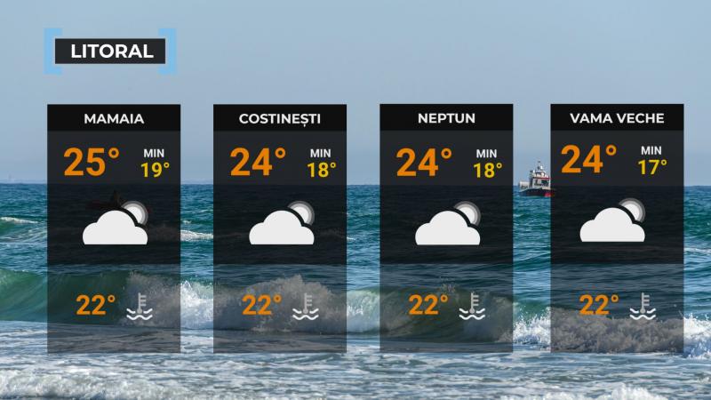 Vremea va fi în general frumoasã, în încãlzire faţã de ziua precedentã. Cerul va prezenta unele înnorãri la început, apoi se va degaja. Vântul va sufla slab şi moderat, cu intensificãri temporare (rafale, în general de 40-45 km/h). Temperaturile maxime se vor încadra între 24 şi 26 grade, iar cele minime între 17 şi 19 grade. Temperatura apei mãrii va avea valori de 21...22 de grade.