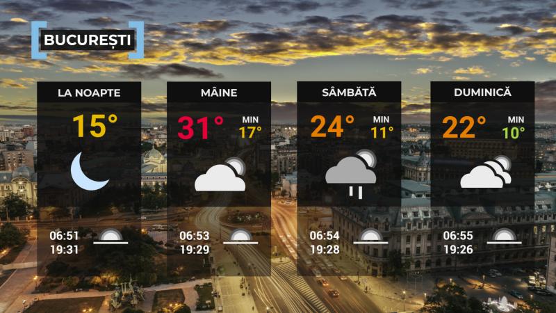 La noapte, cerul va fi mai mult senin, iar vântul va sufla slab şi moderat. Temperatura minimã va fi de 12...15 grade.