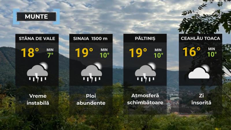 Valorile termice vor fi în scãdere în masivele vestice, iar ploile vor cuprinde treptat cea mai mare parte a zonei montane. Vor fi mai ales averse însoţite de descãrcãri electrice, iar în intervale scurte de timp sau prin acumulare, cantitãţile de apã vor fi de 10...20 l/mp şi izolat de peste 30...40 l/mp. Vor fi condiţii de grindinã. Vântul va sufla moderat, local şi temporar cu intensificãri, precum şi de scurtã duratã asociate ploilor, în general cu viteze de 50...60 km/h, iar în zona montanã înaltã a Carpaţilor Meridionali rafalele vor depãşi 70...80 km/h.
