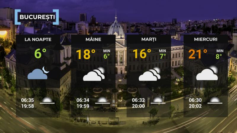 La noapte, cerul va fi variabil, iar vântul va sufla slab pânã la moderat. Temperatura minimã se va situa în jurul celei specifice datei şi va fi de 3...6 grade.