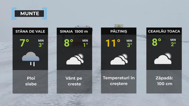 Valorile termice se vor situa în jurul mediilor multianuale specifice perioadei. Cerul va avea înnorãri temporare şi local va ploua slab, iar în zona înaltã vor fi precipitaţii mixte. Vântul va sufla slab şi moderat, local cu intensificãri, rafale de 50...60 km/h.