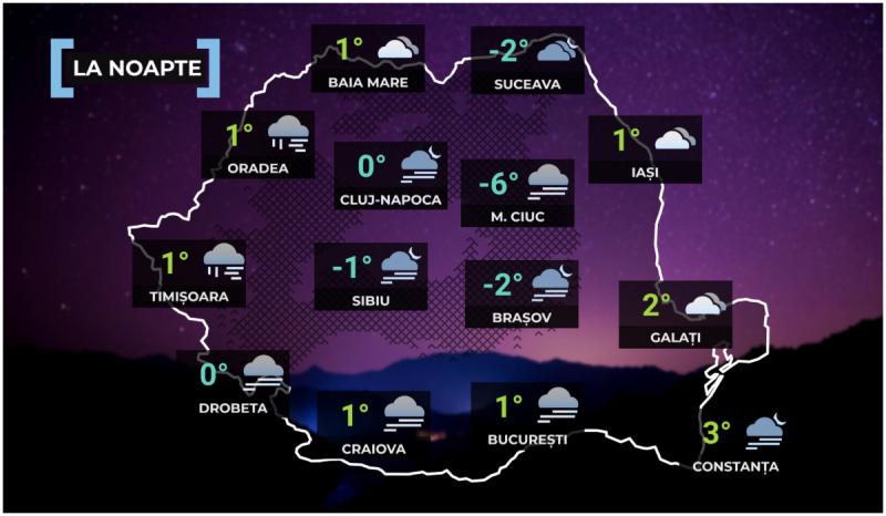 La noapte, cerul va fi variabil în zonele de deal și de munte, în timp ce în regiunile joase va predomina nebulozitatea stratiformă pe parcursul celei mai mari părți a intervalului. Local se va semnala ceață, izolat fiind posibile și ploi slabe sau burniță. Vântul va sufla slab până la moderat, cu unele intensificări temporare pe arii restrânse, în sudul Banatului, în Carpații de Curbură și în nordul Moldovei. Temperaturile minime vor fi mai scăzute față de noaptea precedentă și se vor încadra între -6 și 4 grade Celsius.