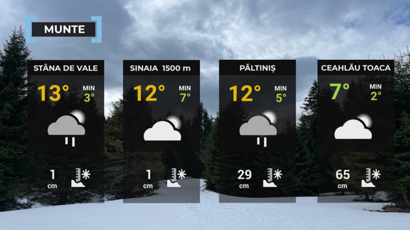 Vremea se va menţine deosebit de caldã pentru mijlocul lunii martie. Cerul va fi variabil, cu înnorãri şi local averse, posibil însoţite de descãrcãri electrice. Izolat, cantitãţile de apã vor putea depãşi 15...20 l/mp. Vântul va avea intensificãri în Carpaţii Occidentali şi Meridionali, cu viteze în general de 50...70 km/h, iar la altitudini mari, în general de peste 1700 m, rafalele vor fi de 70...110 km/h.
