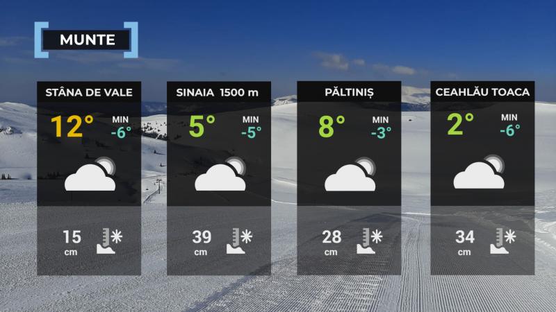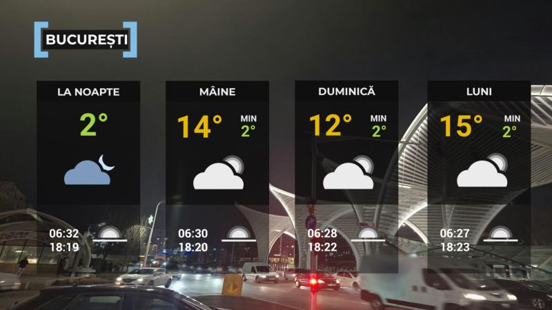 Vremea va fi în continuare în general mult mai caldã decât în mod normal pentru aceastã perioadã. Cerul va fi variabil, însã dimineaţa şi noaptea local vor fi nori joşi sau ceaţã în sud şi est. Vântul va sufla slab şi moderat, temporar cu intensificãri în sudul Banatului (viteze de 50...60 km/h şi izolat de 65...70 km/h), precum şi în nordul Moldovei, pe arii restrânse în Transilvania şi pe crestele Carpaţilor Meridionali (rafale în general de 40...45 km/h şi la altitudini mari la munte de 60...80 km/h). Temperaturile maxime se vor încadra în general între 10 şi 18 grade, iar cele minime se vor situa de la -7 grade în depresiunile din estul Transilvaniei pânã la 7 grade în Dealurile de Vest.