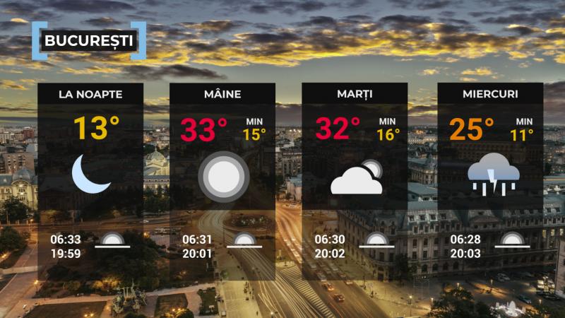 Vremea va fi extrem de caldã pentru mijlocul lunii aprilie în toatã ţara, devenind cãlduroasã dupã-amiaza îndeosebi în jumãtatea de sud; astfel, temperaturile maxime se vor încadra între 22...24 de grade pe litoral şi în deltã şi 34 de grade în sudul Olteniei şi sud-vestul Munteniei (valori cu 12...16 grade peste mediile climatologice), iar cele minime vor fi cuprinse în marea lor majoritate între 5 şi 17 grade. Cerul va fi variabil la senin, dar şi cu înnorãri temporare, averse şi descãrcãri electrice, în a doua parte a zilei, cu totul izolat - în extremitatea de nord a teritoriului, iar noaptea - pe arii restrânse în Maramureş şi nordul Crişanei. Vântul va sufla slab şi moderat, cu intensificãri la munte, unde vor fi rafale de 50...60 km/h, iar în zona înaltã de peste 70 km/h, dar local şi temporar şi în celelalte zone, cu precãdere în nord-vest, centru şi est, cu viteze în general de 40...50 km/h. Presiunea atmosferică va fi în scãdere accentuatã.