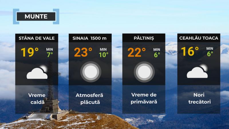 Cerul va fi variabil, cu înnorãri temporare în a doua parte a zilei şi noaptea în nordul Carpaţilor Orientali, unde pe arii restrânse vor fi averse şi descãrcãri electrice. Vântul va avea intensificãri, cu viteze la rafalã de 50...60 km/h, iar în zona înaltã de peste 70 km/h. Valorile termice vor fi mai ridicate faţã de cele din ziua anterioarã.
