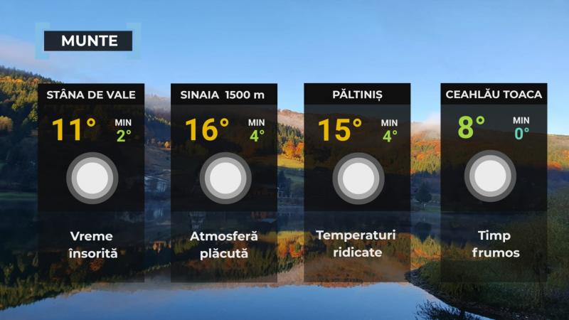 La munte, vremea va fi în general stabilă şi plăcută, cu cer mai mult senin, exceptând regiunile nord-vestice unde vor fi înnorări temporare, iar noaptea nebulozitatea se va accentua, însă doar pe arii restrânse, trecător în nord-vest va ploua slab. Vântul va sufla şi el slab și moderat.