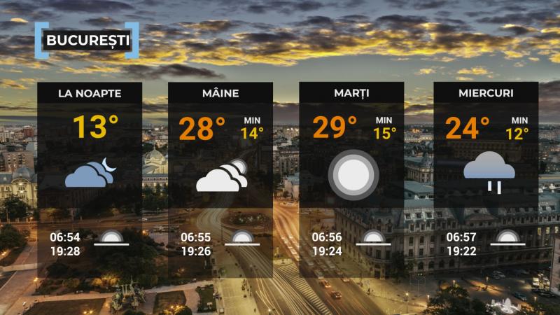 Vremea va fi uşor mai caldã decât în mod obişnuit pentru aceastã perioadã în regiunile sudice şi apropiatã de normal în rest. Ziua, cerul va fi variabil, cu înnorãri mai ales în est, sud-est şi parţial în centru unde vor fi averse şi descãrcãri electrice. Cantitãţile de apã, îndeosebi în zona Carpaţilor Orientali, vor putea depãşi izolat 15...20 l/mp. Pe parcursul nopţii cerul se va degaja treptat. Vântul va sufla slab şi moderat, cu unele intensificãri în sudul Banatului, vestul Olteniei şi pe litoral. Temperaturile maxime se vor situa între 20 şi 30 de grade, iar cele minime între 4 grade în depresiuni şi 17 grade pe litoral. Noaptea pe alocuri se va forma ceaţã. Presiunea atmosferică va fi uşor variabilã, la valori ridicate (câmp anticiclonic).