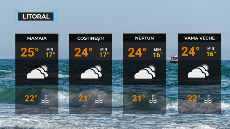 Valorile termice se vor situa în jurul celor specifice datei. Cerul va fi variabil, cu înnorãri spre searã şi în primele ore ale nopţii, când vor fi posibile averse şi descãrcãri electrice. Vântul va sufla slab şi moderat, cu intensificãri trecãtoare. Temperaturile maxime se vor încadra între 23 şi 25 grade, iar cele minime vor fi de 16...17 grade. Temperatura apei mãrii va avea valori de 20...22 de grade.