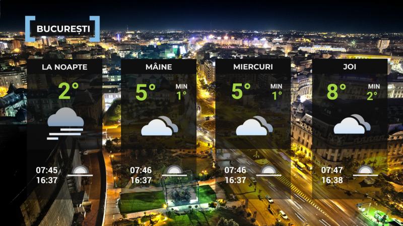 La noapte, în zona joasã a Olteniei şi Munteniei şi izolat a Banatului şi Crişanei precum şi pe arii restrânse în Dobrogea, Transilvania, Maramureş şi sudul Moldovei, va fi nebulozitate stratiformã şi ceaţã, trecãtor asociatã şi cu burniţã. În restul teritoriului cerul va fi variabil, mai mult senin la munte. Vântul va sufla slab şi moderat. Temperaturile minime se vor încadra în general între -7 şi 4 grade.