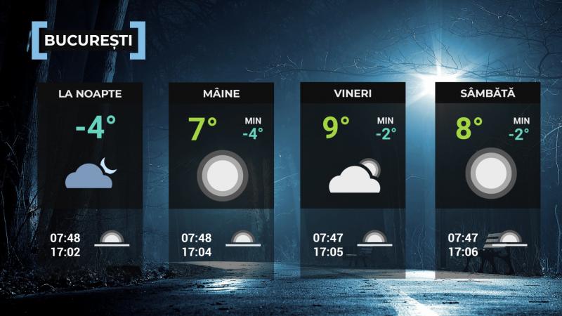 La noapte, cerul va fi variabil, iar vântul va sufla slab pânã la moderat. Temperatura minimã, apropiatã de cea specificã datei, va fi de -8...-4 grade.