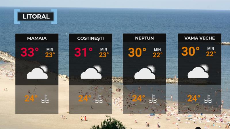 Vremea va fi cãlduroasã, cu disconfortul termic va fi ridicat. Cerul va fi variabil, iar vântul va sufla slab şi moderat.. Temperaturile maxime vor fi de 29...33 de grade, iar cele minime între 20 şi 24 de grade. Temperatura apei mãrii va avea valori de 22... 23 de grade.