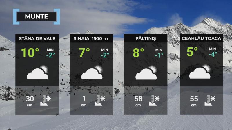 Valorile termice vor fi în continuare mai ridicate faţã de cele normale pentru aceastã perioadã. Cerul va fi variabil, iar vântul va sufla slab pânã la moderat. Temperatura maximã va fi de 10...11 grade, iar cea minimã de 0...2 grade. Presiunea atmosferică va fi usor variabilã.