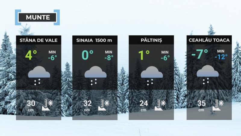 La munte, vremea va fi rece și închisă. Pe parcursul zilei, cerul va fi noros, iar precipitațiile vor fi predominant sub formă de ninsoare. Vântul va sufla moderat, cu intensificări în timpul nopții. În Carpații Meridionali și de Curbură, rafalele vor atinge 70...90 km/h, va fi viscol, iar vizibilitatea va scădea sub 100 de metri.