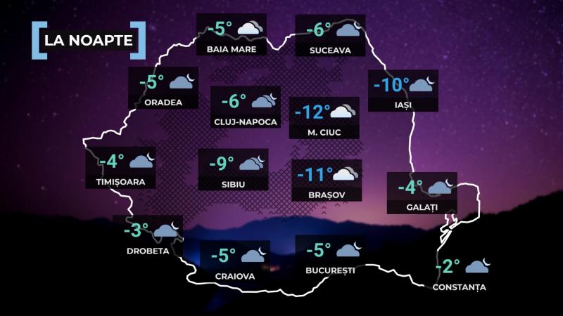 La noapte, cerul va fi variabil, cu înnorãri în Carpaţii Orientali, în Maramureş şi în estul Transilvaniei, unde pe arii restrânse va ninge slab. Vântul va sufla slab şi moderat. Temperaturile minime se vor situa în general între -12 şi -2 grade. Spre sfârşitul intervalului, izolat se va forma ceaţã.