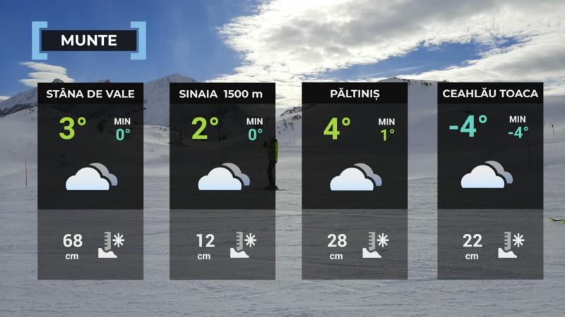 Valorile termice se vor situa peste cele specifice perioadei, astfel cã temperaturile maxime se vor încadra între 1 şi 11 grade, cu cele mai mari valori în Dealurile de Vest, iar cele minime vor fi cuprinse între -3 şi 8 grade. Cerul va avea înnorãri temporare şi vor fi precipitaţii, ziua în vestul, nord-vestul şi parţial în centrul ţãrii, iar noaptea local şi în sud şi est. Acestea vor fi mixte la munte şi în Maramureş şi mai ales sub formã de ploaie în celelalte regiuni. Izolat se va depune polei, iar în nord-vest vor fi cantitãţi de apã de peste 15...20 l/mp. Vântul va sufla slab şi moderat, cu intensificãri temporare în vest, nord şi est, cu viteze în general de 45...55 km/h, dar şi la munte, unde rafalele vor depãşi 70...80 km/h la altitudini mari. Mai ales dimineaţa, cu totul izolat se va forma ceaţã. Presiunea atmosferică va fi în scãdere.