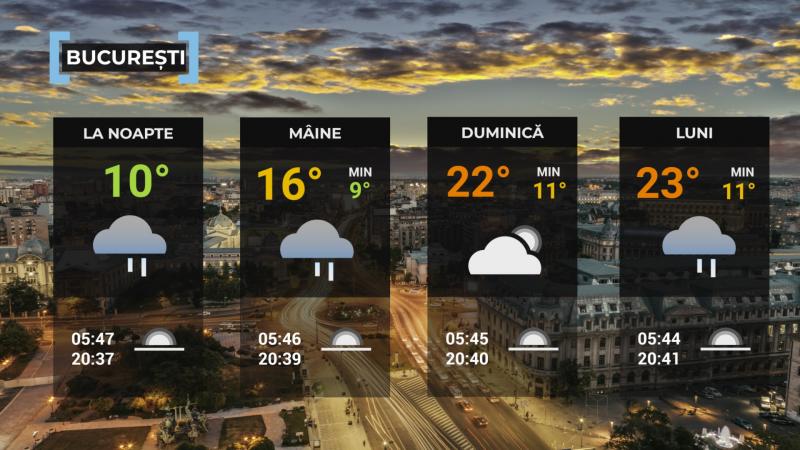 La noapte, cerul va fi noros, temporar va ploua şi se vor acumula cantitãţi de apã moderate (10...15 l/mp). Vântul va sufla slab şi moderat. Temperatura minimã va fi de 9...10 grade.