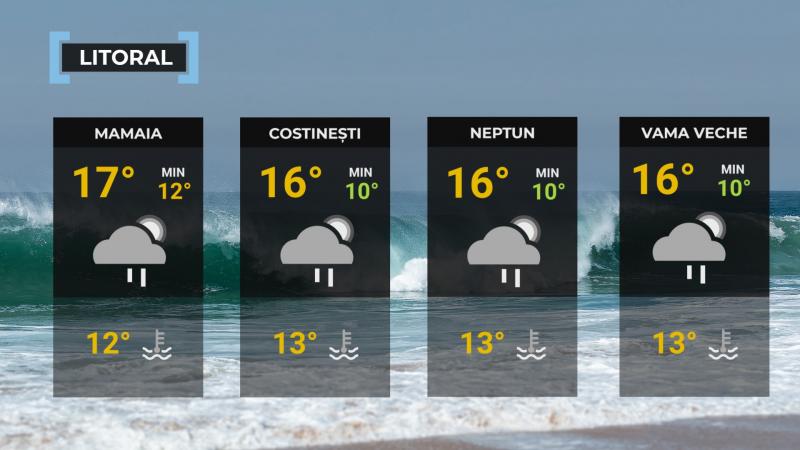 Vremea va fi mult mai rece pentru aceastã perioadã. Cerul va avea înnorãri temporare în prima parte a zilei, când trecãtor va ploua slab şi sub formã de aversã. Vântul va sufla moderat, cu intensificãri temporare în prima parte a intervalului (rafale de 50 - 60 km/h). Temperaturile maxime vor fi de 16...17 grade, iar cele minime se vor situa între 10 şi 12 grade.