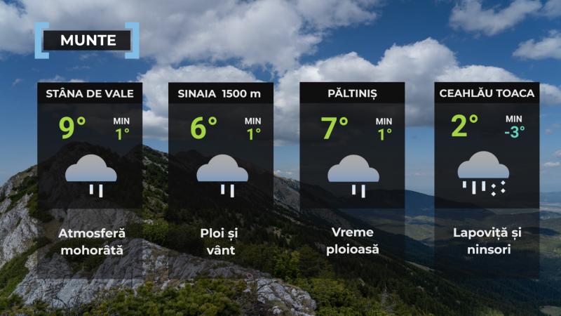 La noapte, cerul va fi mai mult noros şi va ploua în Oltenia, Muntenia, Transilvania, Dobrogea, Moldova şi cu totul izolat în celelalte regiuni. Ploile vor avea şi caracter de aversã şi îndeosebi în nordul Olteniei şi al Munteniei, în intervale scurte de timp sau prin acumulare, se vor înregistra cantitãţi de apã de 10...20 l/mp şi pe suprafeţe mici de peste 25...30 l/mp. La munte, la altitudini în general de peste 1500 m, vor fi precipitaţii şi sub formã de lapoviţã şi ninsoare şi local se va depune strat de zãpadã (10...15 cm). Vântul va sufla slab şi moderat, cu unele intensificãri la munte, la altitudini mari, unde la rafalã se vor depãşi viteze de 60...80 km/h. Temperaturile minime vor fi cuprinse, în general, între 5 şi 12 grade. Izolat vor fi condiţii de ceaţã.