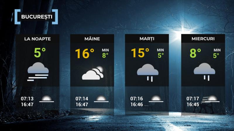 În cursul nopții, în zonele joase din sudul, sud-estul, dar și local în centrul și estul țării, se va menține nebulozitatea joasă, iar pe alocuri va apărea ceața, izolat însoțită de burniță. În restul regiunilor, cerul va avea înnorări temporare, însă doar pe suprafețe restrânse, iar în nord-vest sunt posibile ploi slabe, trecătoare. Vântul va sufla slab până la moderat, iar temperaturile minime se vor situa, în general, între -2 și 8 grade.