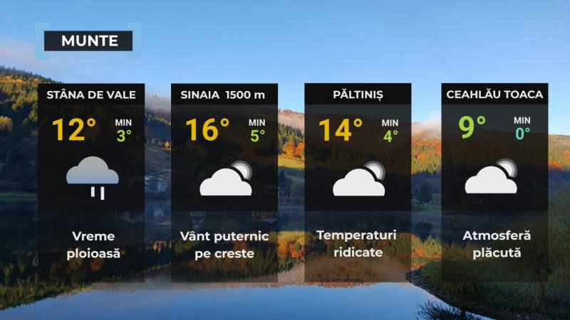 La munte și în zonele de deal, vremea va fi mai caldă decât în mod obișnuit pentru această perioadă. Vântul va sufla slab până la moderat, însă în zona montană înaltă a Carpaților Orientali și a Munților Apuseni se vor înregistra intensificări, cu rafale ce vor atinge 70…90 km/h. Trecător, vor fi intensificări ale vântului și în Crișana, unde vitezele pot ajunge la 40…45 km/h.