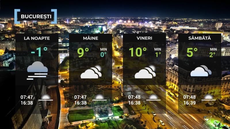 La noapte, cerul va fi variabil, temporar cu nebulozitate joasã stratiformã şi ceaţã, posibil asociate cu burniţã, în prima parte a zilei şi în a doua parte a nopţii. Vântul va sufla slab pânã la moderat. Temperatura maximã se va situa în jurul valorii de 8 grade, iar cea minimã va fi de -2...0 grade.
