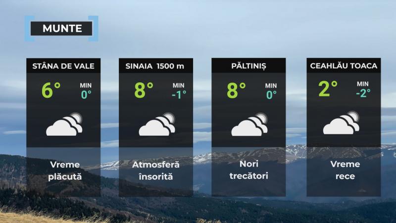 Valorile termice se vor situa în continuare peste cele specifice perioadei. Cerul va fi temporar noros şi pe alocuri, mai ales pe parcursul zilei şi seara, vor fi ploi slabe, cu precãdere în Carpaţii Orientali şi în Munţii Apuseni. Pe creste vor fi posibile fulguieli. Vântul va sufla slab şi moderat, cu uşoare intensificãri, în special în zona Carpaţilor de Curburã.