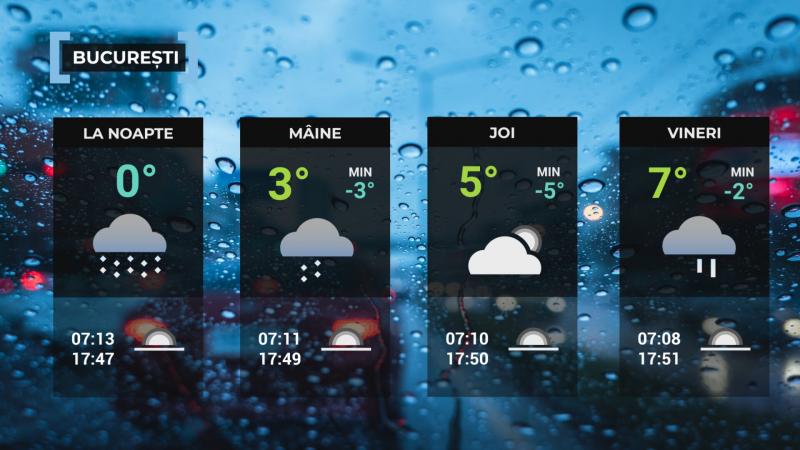 Vremea va rămâne rece în Moldova, estul Munteniei și în Dobrogea, unde maximele se vor încadra între -6 și 1 grad. În restul regiunilor, valorile diurne vor fi apropiate de normalul perioadei, cu temperaturi cuprinse între 2 și 8 grade. Pe parcursul zilei, în jumătatea de est a țării, cerul va fi noros și va continua să ningă, urmând să se depună un nou strat de zăpadă, în medie de 10–15 cm. În primele ore, în Dobrogea, vor fi și precipitații mixte, cu condiții de polei. În celelalte zone, cerul va fi temporar noros, iar precipitațiile vor fi slabe și izolate, mai ales sub formă de lapoviță și ninsoare.