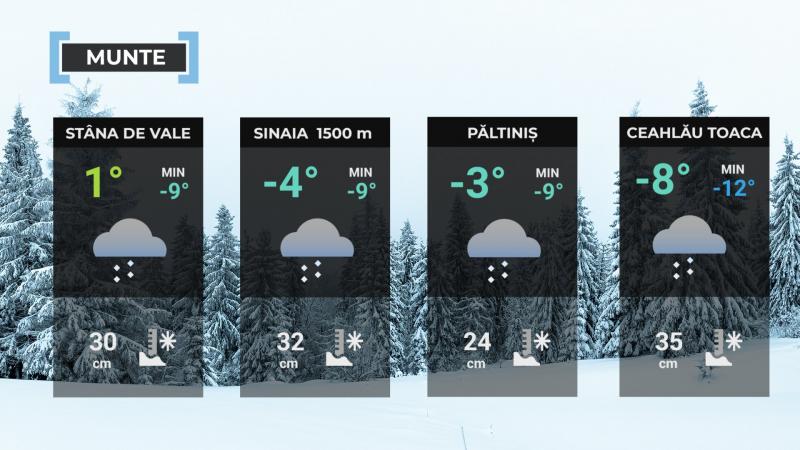 La munte, vremea se va menține rece, cu înnorări și ninsori, în special pe timpul zilei, în masivele din jumătatea estică, unde se va depune un nou strat de zăpadă, în medie de 10–15 cm. Vântul va avea intensificări în Carpații Meridionali și de Curbură, cu rafale de 70–90 km/h, viscolind ninsoarea și reducând vizibilitatea sub 100 de metri. Pe timpul nopții, cerul va fi variabil, dar local vor mai apărea înnorări și ninsori slabe. Temperaturile minime se vor încadra între -8 și 1 grad, iar izolat se va semnala ceață.