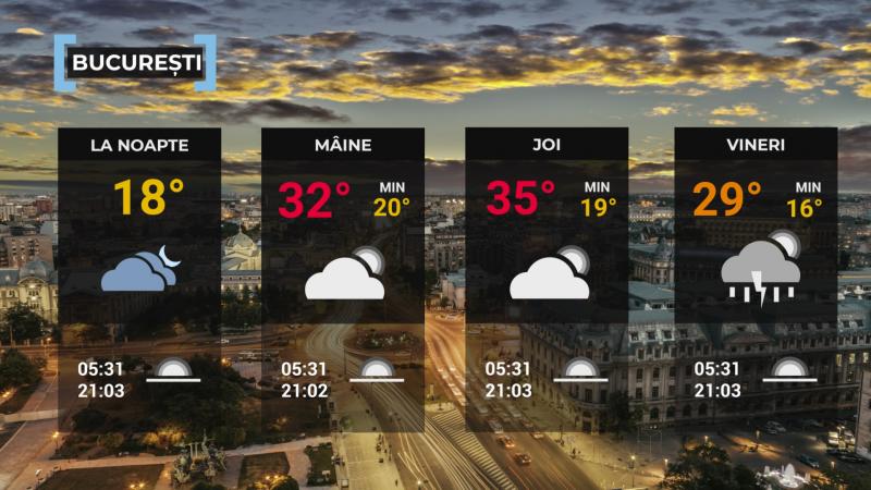 Vremea va fi cãlduroasã, cu disconfort termic. Cerul va fi variabil, mai mult senin dimineaţa şi noaptea. Vântul va sufla moderat, iar în a doua parte a intervalului, slab. Temperatura maximã va fi de 30...32 de grade, iar cea minimã de 19...20 grade, mai scãzutã în zona preorãşeneascã spre 16 grade. Presiunea atmosferică va fi usor variabilã.