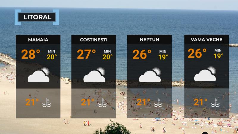 Vremea va fi în general frumoasã. Cerul va fi variabil, iar vântul va sufla moderat. Temperaturile maxime vor fi cuprinse între 26 şi 28 de grade, iar cele minime între 18 şi 21 de grade. Temperatura apei mãrii va avea valori de 21... 22 de grade.