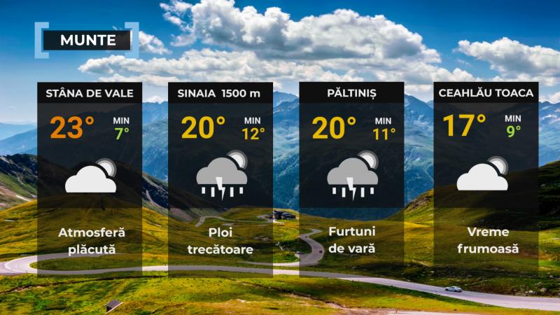 Vremea va fi cãlduroasã în jumãtatea de sud-vest a ţãrii, izolat canicularã în sudul Olteniei. Va fi şi disconfort termic, mai ridicat în jumãtatea sudicã a Olteniei şi în sud-vestul Munteniei, unde indicele temperaturã-umezealã (ITU) va atinge pragul critic de 80 de unitãţi. Cerul va fi variabil, temporar cu înnorãri, averse, descãrcãri electrice şi intensificãri de scurtã duratã ale vântului, dupã-amiaza şi seara, în Carpaţii Meridionali şi de Curburã, pe alocuri în Subcarpaţii Getici şi izolat în restul Olteniei şi al Munteniei, în sudul şi sud-estul Transilvaniei şi posibil în Dobrogea. Punctiform, în special la munte, cantitãţile de apã vor depãşi 20...25 l/mp. Temperaturile maxime vor fi cuprinse între 26 şi 35 de grade, iar cele minime se vor încadra între 10 şi 20 de grade, cu valori mai scãzute în depresiunile Carpaţilor Orientali, spre 7 grade. Dimineaţa şi noaptea izolat se va semnala ceaţã în depresiuni. Presiunea atmosferică va fi usor variabilã.