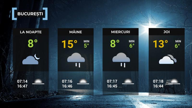 La noapte, cerul va fi variabil, cu probabilitate de înnorãri şi ploi slabe spre finalul intervalului. Vântul va sufla slab pânã la moderat. Temperatura minimã va fi de 7...8 grade.