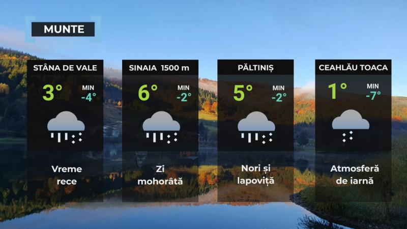 Vremea se va rãci accentuat. Cerul va fi mai mult noros, vor predomina ninsorile şi se va depune strat de zãpadã. Vântul va sufla slab şi moderat, cu intensificãri temporare la altitudini mari, în special în Carpaţii Orientali, unde rafalele vor fi de 60...80 km/h.