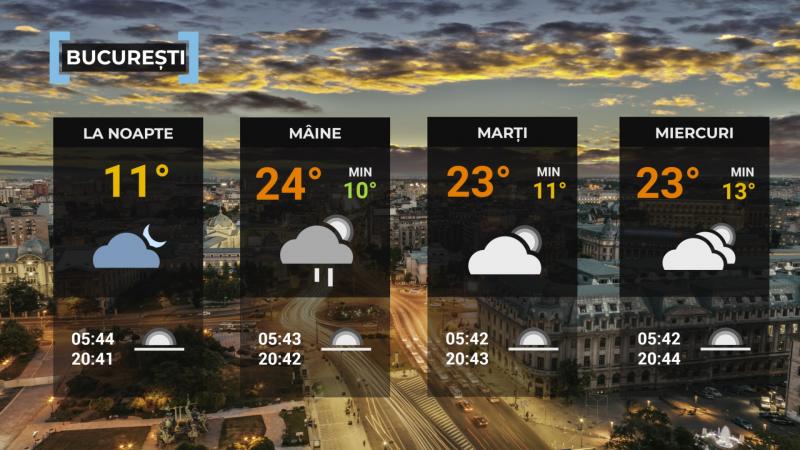 La noapte, temporar vor fi înnorãri şi averse în Maramureş, Crişana, Banat, vestul şi nordul Transilvaniei şi în zonele montane aferente. La altitudini în general de peste 1500 m se vor semnala precipitaţii mixte. Cantitãţile de apã vor depãşi izolat 15...20 l/mp, cu precãdere în Munţii Apuseni şi nordul Carpaţilor Orientali. În celelalte regiuni cerul va fi variabil şi ploi de scurtã duratã vor fi doar pe areale mici. Vântul va avea intensificãri pe crestele montane, cu rafale de peste 70...80 km/h, dar pe arii restrânse şi la intensitãţi mai mici şi în restul teritoriului, cu precãdere în nord-vest, centru şi sud-est. Temperaturile minime vor fi cuprinse între 3 şi 14 grade. Izolat se va forma ceaţã.