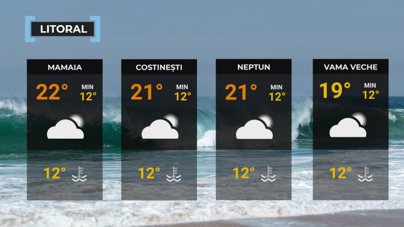 Vremea va fi apropiatã de normalul termic al acestei date. Cerul va avea înnorãri temporare dupã-amiaza şi noaptea, când trecãtor vor fi averse şi descãrcãri electrice. Vântul va sufla moderat, cu intensificãri temporare ziua(rafale de 50 - 60 km/h), apoi va mai scãdea în intensitate. Temperaturile maxime vor fi cuprinse între 19 şi 22 de grade, iar cele minime între 10 şi 12 grade. Temperatura apei mãrii va avea valori între 11 şi 13 grade.