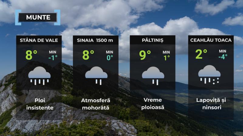 Vremea va fi în general instabilã, iar valorile termice cu mult mai scãzute decât în mod normal la aceastã datã. În cursul zilei vor fi perioade cu înnorãri accentuate, averse şi descãrcãri electrice. Pe arii restrânse vor fi cantitãţi de apã însemnate, peste 15...25 l/mp şi condiţii de grindinã. La altitudini în general mai mari de 1500 m va ninge şi se va depune strat de zãpadã (în medie de 3...6 cm). Noaptea aria precipitaţiilor se va restrânge. Temporar vântul va avea intensificãri, cu viteze în general de 40...60 km/h, iar în zona înaltã, de peste 80...90 km/h.