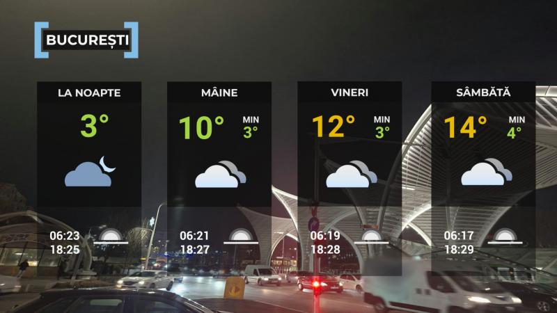 În București, temperaturile din timpul zilei vor fi în scădere față de intervalul anterior. Cerul va avea înnorări, însă șansele de ploaie rămân reduse. Vântul va sufla în general moderat. Temperatura maximă va ajunge la 9–10 grade, iar cea minimă va coborî la 1–3 grade.