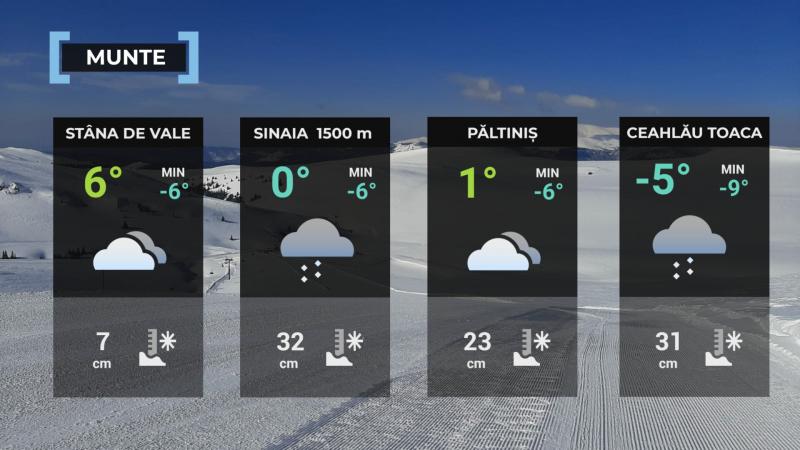 La munte, vremea va fi în general închisă, cu cer predominant noros și ninsori slabe, mai ales în Carpații Orientali și izolat în cei Meridionali. Vântul va avea intensificări la altitudini mari, unde rafalele pot atinge 60–80 km/h. Temperaturile se vor menține scăzute, apropiate de normalul acestei perioade.