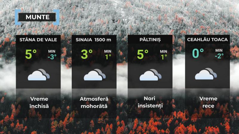 Valorile termice diurne se vor situa în jurul mediilor multianuale specifice perioadei în majoritatea masivelor montane. Cerul va fi noros şi local va ploua, iar pe creste vor fi precipitaţii sub formã de lapoviţã şi ninsoare. Vântul va sufla slab şi moderat.