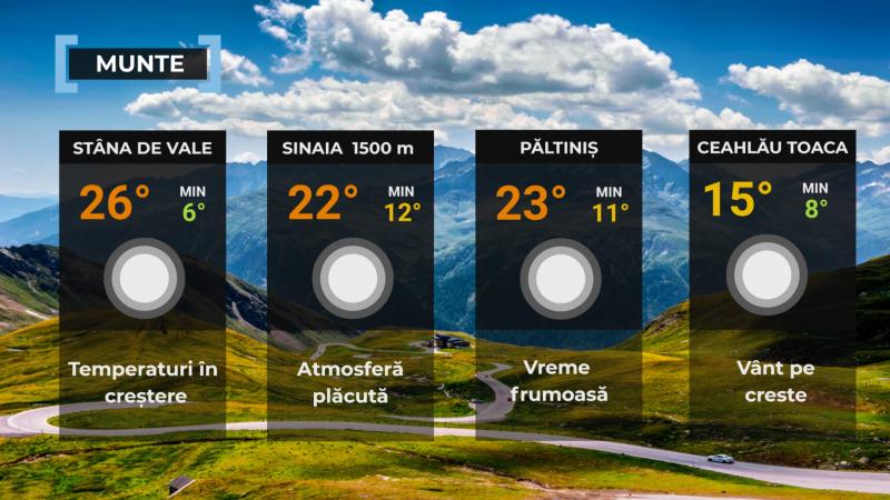 Vremea se va menţine cãlduroasã în regiunile vestice, sudice şi pe arii restrânse în cele nord-vestice şi centrale. Cerul va fi mai mult senin. Vântul va sufla slab şi moderat, temporar cu uşoare intensificãri pe parcursul zilei în Moldova, Dobrogea şi la altitudini mari la munte. Temperaturile maxime se vor încadra de la 25...26 de grade pe litoral şi pânã la 34...35 de grade în sud-vestul ţãrii, iar cele minime între 5...6 grade în estul Transilvaniei şi 21...22 de grade în Dealurile de Vest. Presiunea atmosferică va fi uşor variabilã.