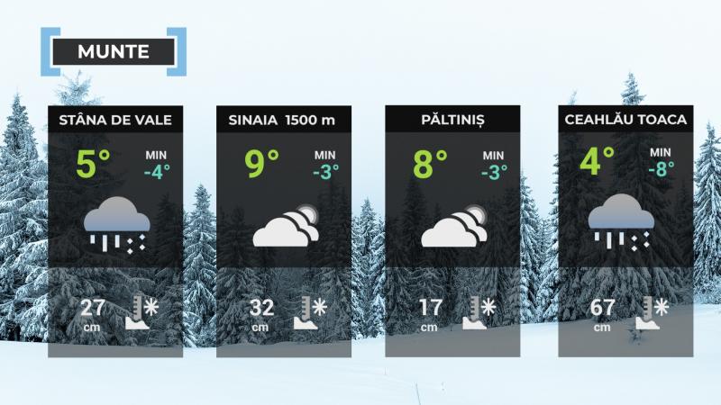 Pe parcursul zilei cerul va avea înnorãri temporare şi pe spaţii mici va ploua, iar în zona înaltã precipitaţiile vor fi mixte. Noaptea vor predomina ninsorile şi cu precãdere la altitudini de peste 1400 m se va depune strat de zãpadã. Vântul va sufla slab şi moderat, local cu intensificãri îndeosebi în a doua parte a intervalului (viteze în general de 45...55 km/h). Valorile termice vor scãdea uşor faţã de intervalul anterior.