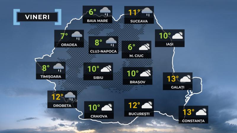 În sudul şi estul ţãrii valorile termice se vor situa mult peste cele specifice datei (abatere de 8...10 grade), iar în celelalte zone vor scãdea faţã de ziua precedentã. Temperaturile maxime se vor încadra între 2 şi 14 grade, iar cele minime între -2 şi 6 grade. Pe parcursul zilei cerul va fi variabil, cu înnorãri şi ploi slabe în Banat, Crişana, Maramureş, local în Transilvania şi nordul Moldovei şi izolat în Oltenia. Seara şi noaptea nebulozitatea se va extinde în toatã ţara şi vor fi precipitaţii, local moderate cantitativ în sud-vest (10...15 l/mp).