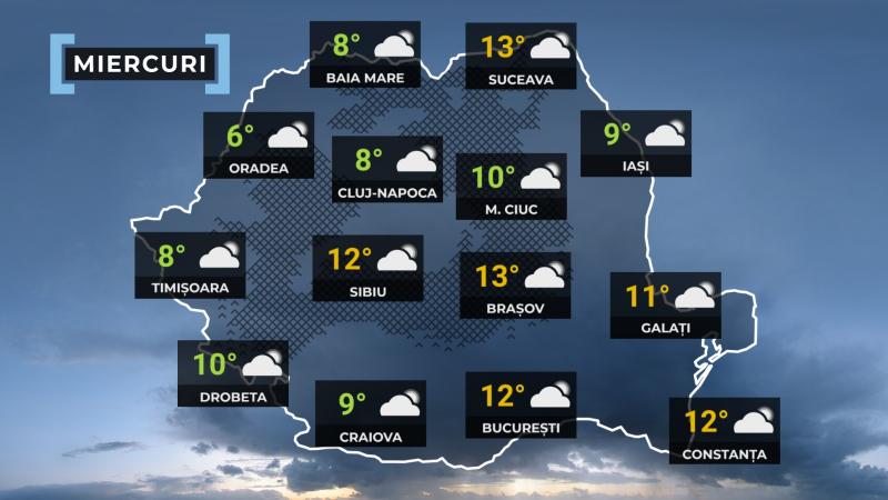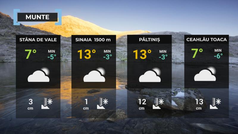 În cea mai mare parte a ţãrii regimul termic, în special cel diurn, se va menţine peste cel specific datei. Cerul va fi variabil, dar cu nebulozitate stratiformã sau ceaţã la începutul intervalului pe alocuri în zonele joase de relief, iar noaptea îndeosebi în regiunile intracarpatice. Izolat vor fi condiţii de burniţã şi, pe crestele montane, fulguieli. Vântul va sufla slab şi moderat, cu unele intensificãri la munte, în special în Carpaţii Meridionali, dar şi în sud-vestul teritoriului. Temperaturile maxime se vor încadra în general între 3 şi 13 grade, iar cele minime între -5 grade în estul Transilvaniei şi 5 grade pe litoral. Presiunea atmosferică va scãdea în timpul zilei, apoi noaptea va fi în creştere.