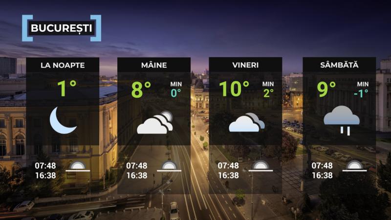 Cerul va fi temporar noros, iar vântul va sufla slab şi moderat. Temperatura maximã, mai coborâtã decât în ziua anterioarã, dar în continuare mai mare decât cea climatologic specificã datei se va situa în jurul valorii de 8 grade, iar cea minimã va fi de -1...0 grade, mai scãzutã în zona preorãşeneascã. Dimineaţa, vor fi condiţii de ceaţã. Presiunea atmosferică va scãdea accentuat.